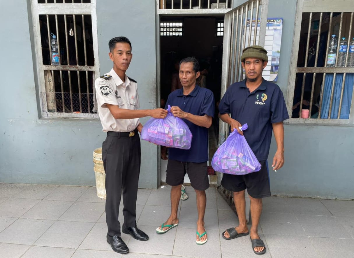 Adapun paket kebersihan yang dibagikan meliputi sabun mandi, shampo, odol, sikat gigi, serta sabun cuci. Bantuan ini diberikan guna menunjang kebutuhan dasar warga binaan sekaligus menjaga kebersihan diri dan lingkungan hunian agar tetap sehat dan nyaman.