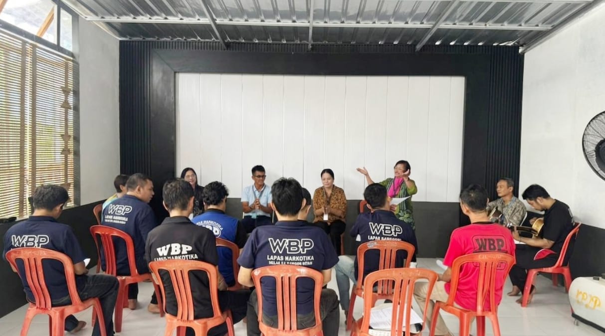 Suasana penuh damai terasa di Lembaga Pemasyarakatan (Lapas) Narkotika Kelas IIA Karang Intan pada Sabtu (14/3). Sebanyak 9 Warga Binaan yang beragama Nasrani mengikuti kegiatan kebaktian keagamaan onsite yang diselenggarakan bekerja sama dengan Yayasan Pelayanan Warga Binaan Pemasyarakatan (YPWBP) Cahaya Kasih.