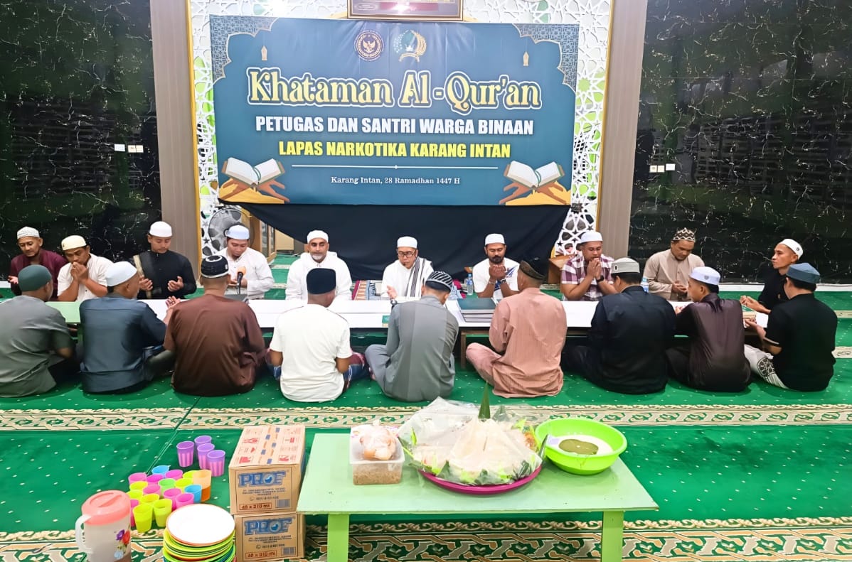 Suasana khidmat dan penuh ketenangan menyelimuti Masjid At-Taubah Lapas Narkotika Kelas IIA Karang Intan pada Selasa, 17 Maret 2026. Petugas bersama santri Warga Binaan melaksanakan kegiatan Khataman Al-Qur’an sebagai bentuk pembinaan spiritual yang terus digencarkan di dalam Lapas.