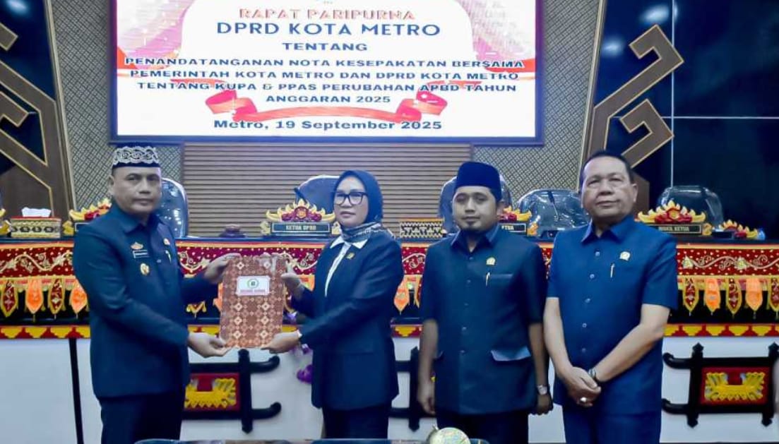 Dewan Perwakilan Rakyat Daerah (DPRD) Kota Metro bersama Pemerintah Kota Metro menandatangani Nota Kesepakatan Bersama tentang Kebijakan Umum Perubahan Anggaran (KUPA) dan Perubahan Prioritas Plafon Anggaran Sementara (PPAS) Tahun Anggaran 2025. Penandatanganan dilaksanakan dalam rapat paripurna DPRD Kota Metro, Jumat (19/09/2025).