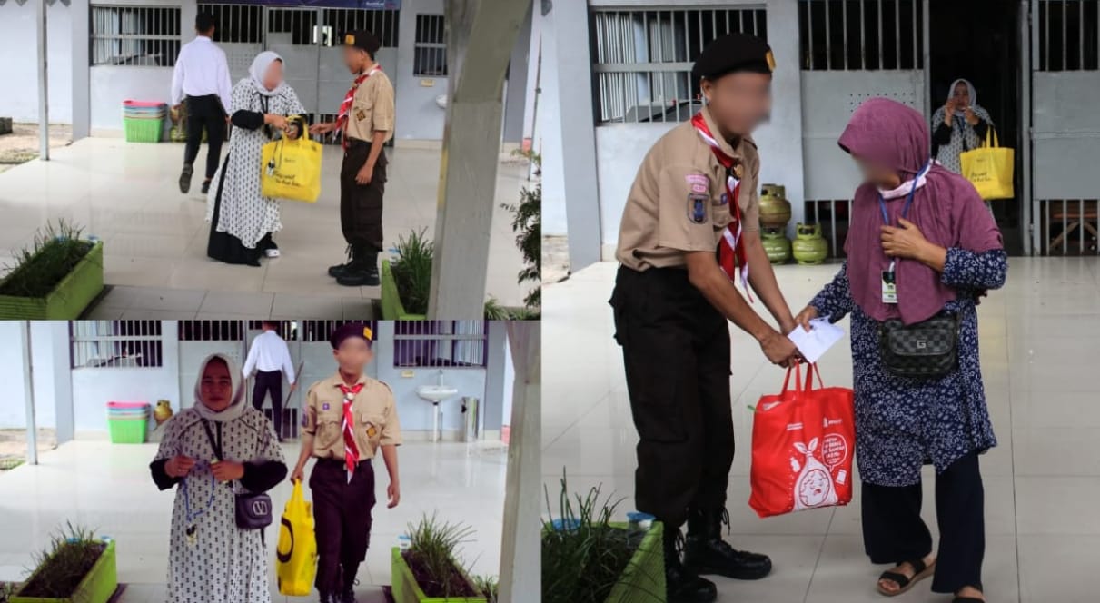 Dengan penuh semangat dan sikap sopan, para anggota Pramuka menyambut kedatangan pengunjung, membantu membawakan barang bawaan mereka, serta mengarahkan ke area kunjungan dengan tertib. Kehadiran mereka memberikan kesan ramah dan membantu menciptakan suasana yang nyaman bagi keluarga yang datang menjenguk.